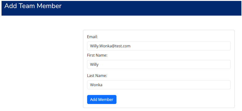 - Enter the team member’s email address, First and Last Name and click the Add Member button.